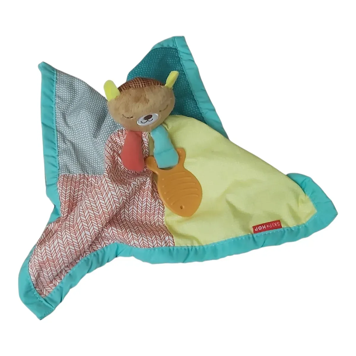 Manta de apego marca Skip Hop en buen estado. Incluye peluche y mordedera, ideal para acompañar al bebé y brindarle seguridad. Tela suave y ligera, perfecta para estimulación y descanso.